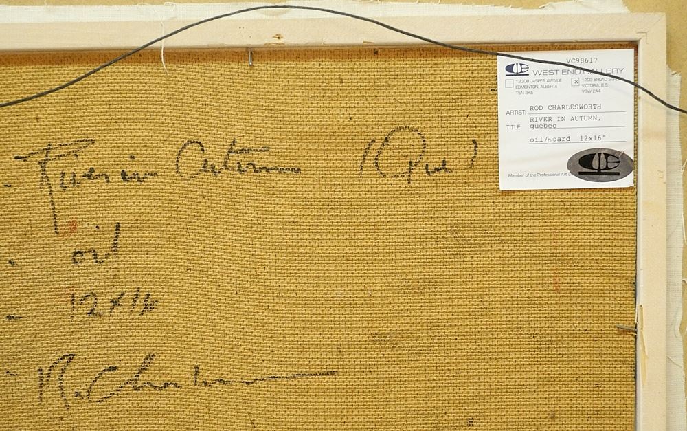 LOT 88 Oil on Board signed (Rod) Charlesworth, 12" x 16", "River in Autumn, Quebec". Estimate: $400 - $600 Sold For: $400 Auction Date: Tuesday, May 07 2024 at 4:00 PM
