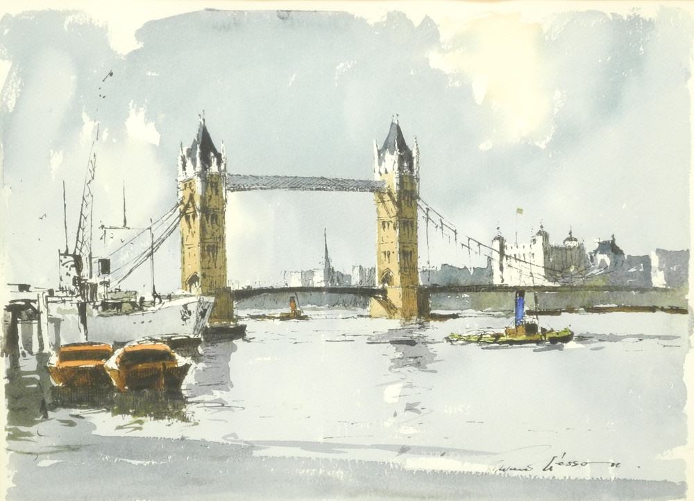 Watercolour signed Wesson, 10 1/2" x 14 1/2", "Tower Bridge".