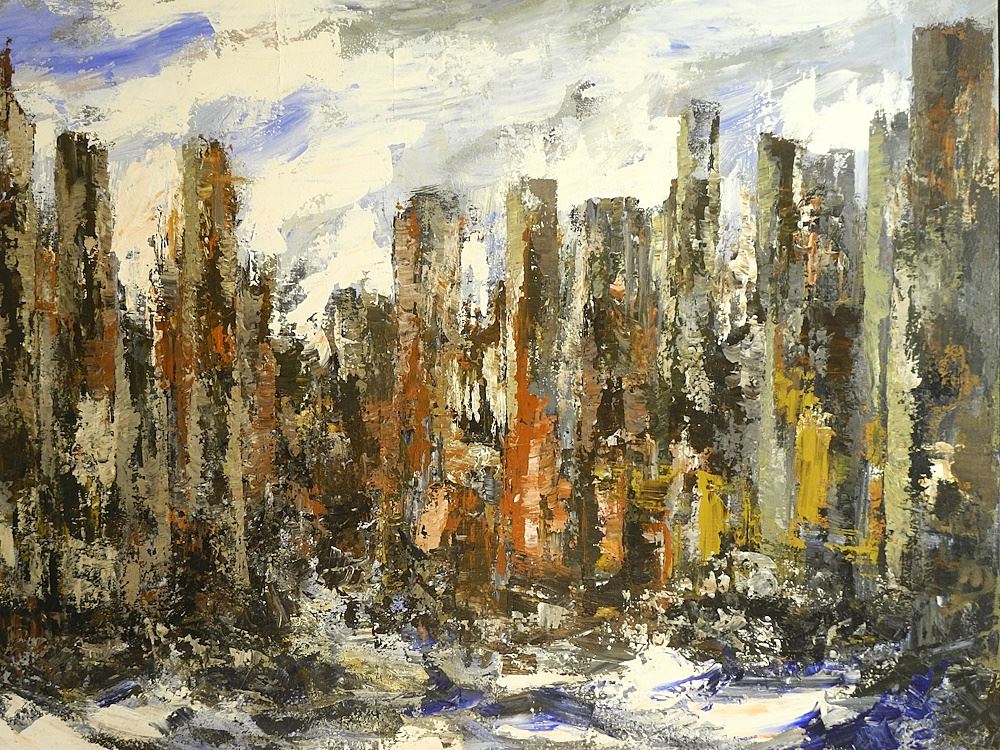 LOT 83 Oil on Canvas signed Tom (Reimer), 38" x 48", "Modernist Cityscape". Estimate: $100 - $200 Sold For: $160 Auction Date: Tuesday, May 07 2024 at 4:00 PM