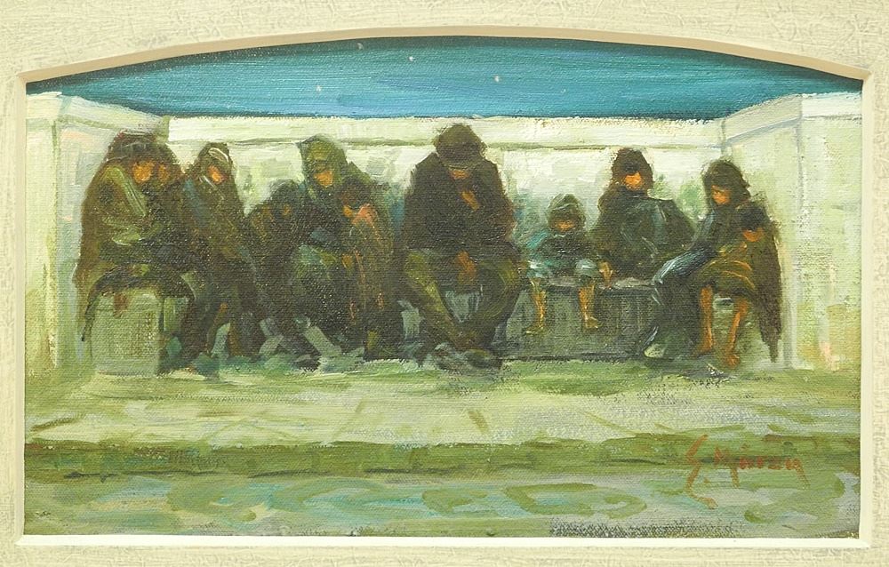 Oil on Canvas Mounted on Board signed E. (Ernest) Marza, 8 1/8" x 13 3/8", "Huddled Figures"