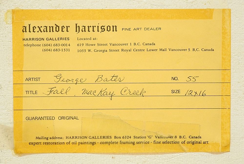 LOT 37 Oil on Board signed G.W. (George William) Bates, 12" x 16", "Fall, Mackay Creek". Estimate: $200 - $300 Sold For: $170 Auction Date: Tuesday, May 07 2024 at 4:00 PM