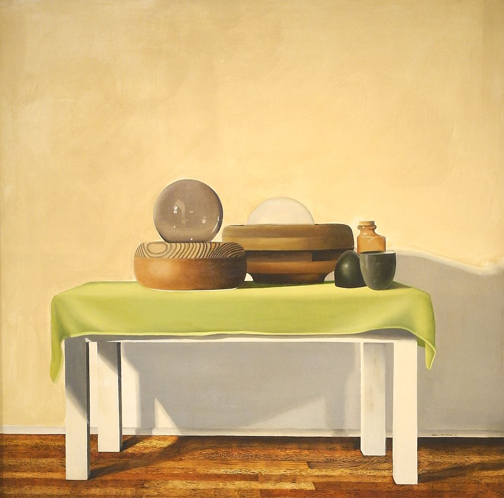 LOT 47 Oil on Board signed Drew McRitchie ' 74, 47 1/2" x 47 1/2", "Still Life with Reflective Spheres". Estimate: $1,100 - $1,500 Auction Date: Tuesday, May 07 2024 at 4:00 PM