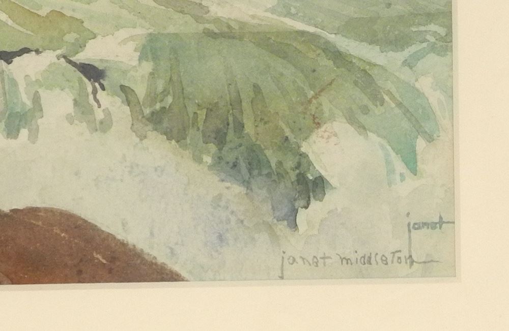 LOT 253 Watercolour signed Janet Middleton, 13 3/4" x 13 3/8", "Shuswap Falls" (glass noted). Estimate: $100 - $150 Sold For: $275 Auction Date: Tuesday, October 29 2024 at 4:00 PM