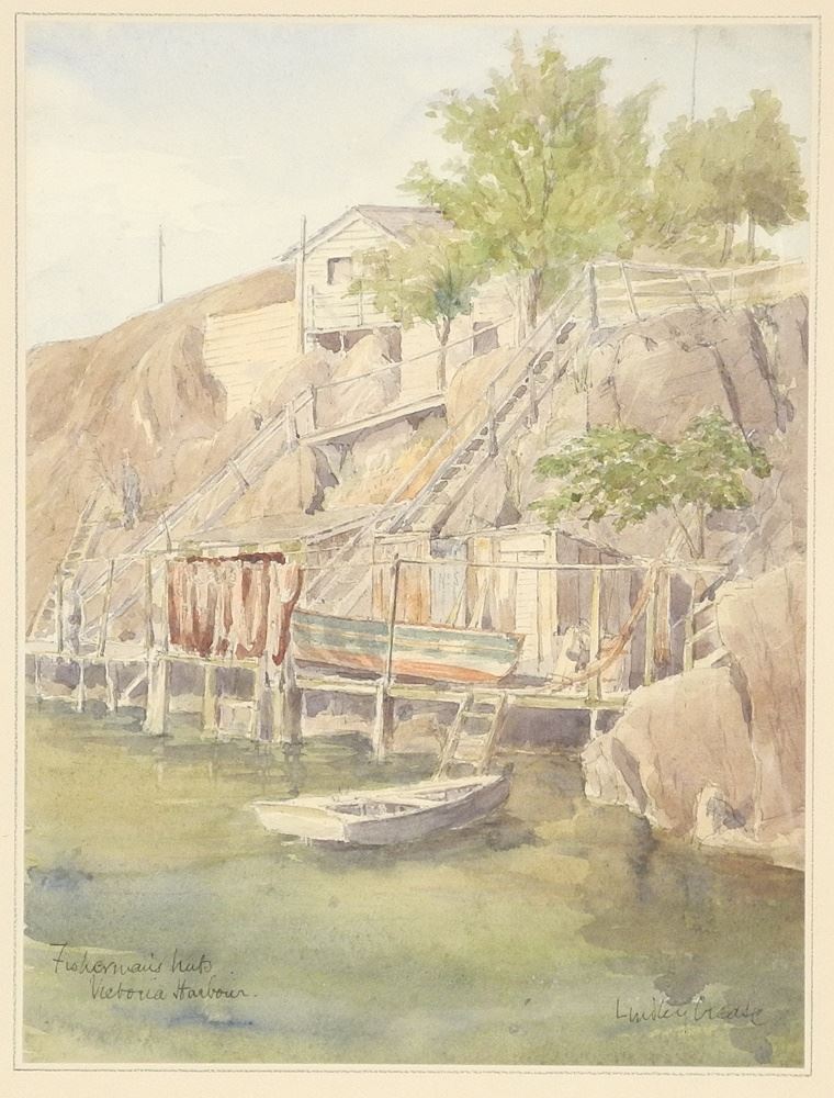 LOT 86 Watercolour signed Lindley Crease, 11 7/8" x 9", "Fisherman's Huts, Victoria Harbour". Estimate: $100 - $200 Sold For: $400 Auction Date: Tuesday, October 29 2024 at 4:00 PM