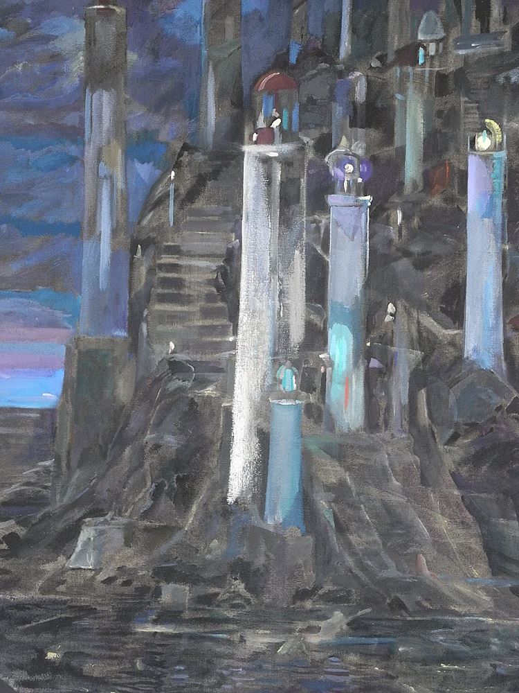 Oil on Canvas signed Howarth, 45 1/8" Diam., "Rocky Shore with Lights".