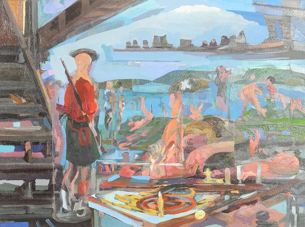 Unsigned Oil on Canvas, 18" x 24", "Guarded Figures".