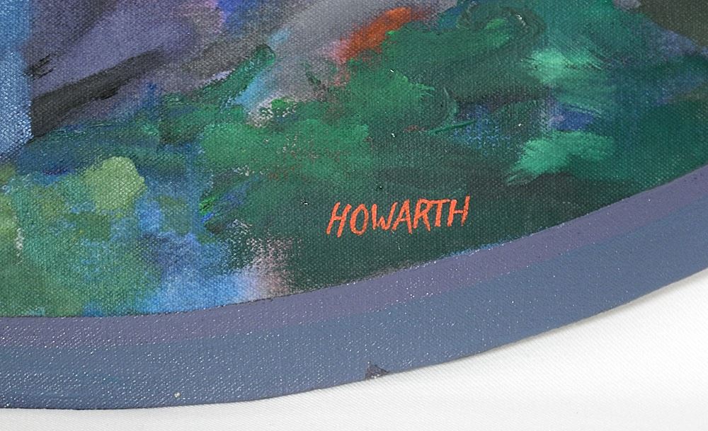 LOT 30 Oil on Canvas Board signed Howarth, 34 1/8" Diameter, "Coastal Scene with Helicopter". Estimate: $100 - $200 Sold For: $180 Auction Date: Tuesday, October 29 2024 at 4:00 PM
