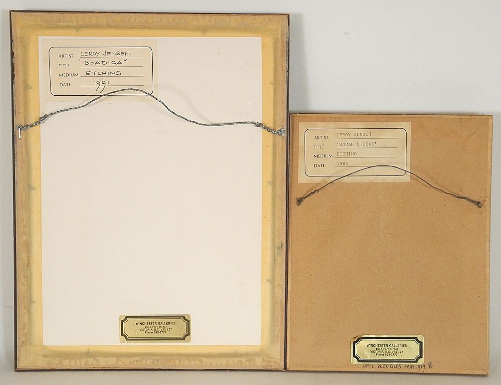 2 Etchings signed LeRoy (Jensen), Largest 3 7/8" x 2 7/8", "Boadica" & "Woman's Head".