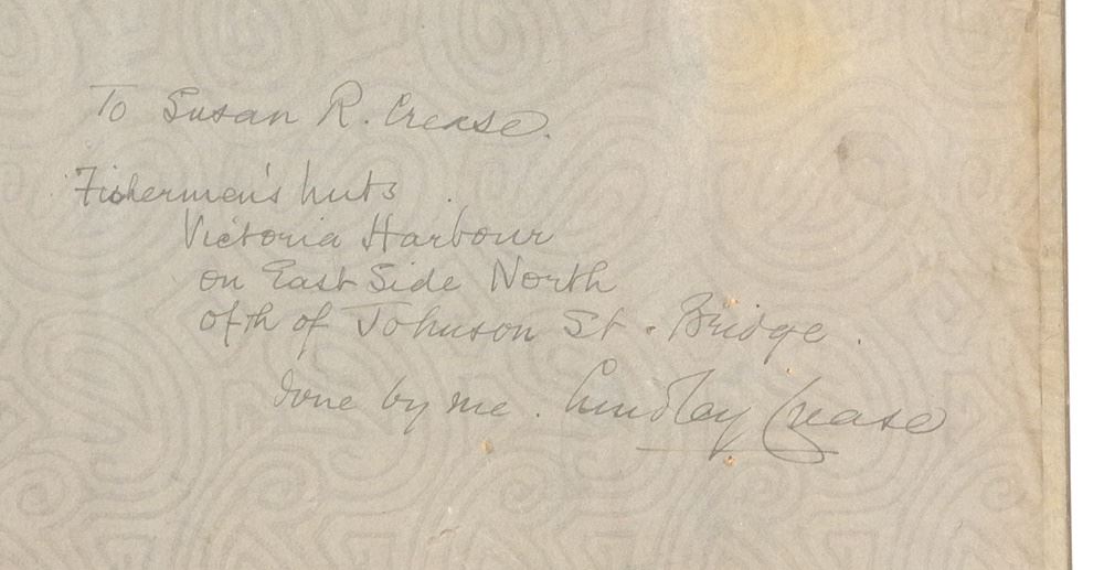 LOT 86 Watercolour signed Lindley Crease, 11 7/8" x 9", "Fisherman's Huts, Victoria Harbour". Estimate: $100 - $200 Sold For: $400 Auction Date: Tuesday, October 29 2024 at 4:00 PM
