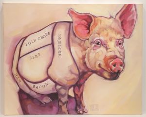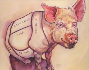 Oil on Canvas signed Carrie Cook, 24" x 30", "Ham / Bacon / Ribs...".