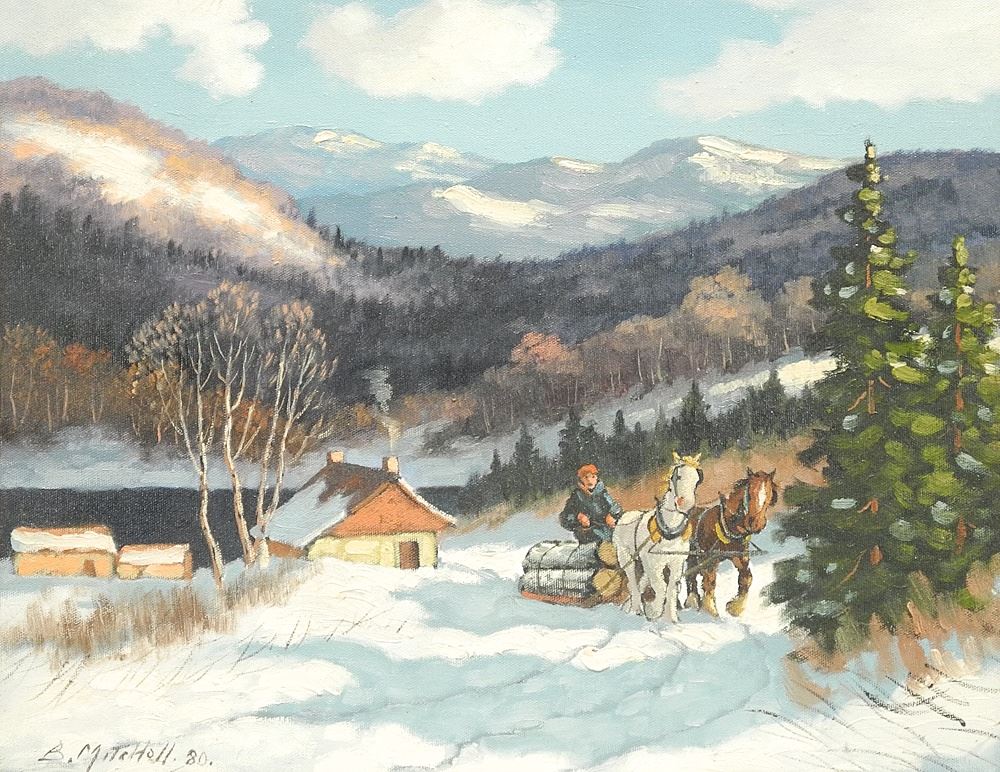 LOT 75 Oil on Canvas signed B. (Bruce) Mitchell'80, 16 x 20", "Hauling Logs , Quebec". Estimate: $200 - $400 Sold For: $225 Auction Date: Tuesday, March 04 2025 at 4:00 PM