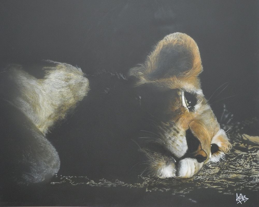 Mixed Media on Canvas signed Archer, 48" x 60", "Lion Cub", Proceeds to Victoria SPCA.