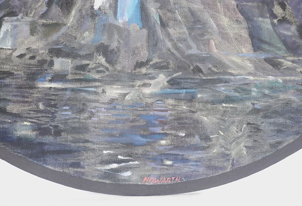 LOT 138 Oil on Canvas signed Howarth, 45 1/8" Diam., "Rocky Shore with Lights". Estimate: $100 - $200 Sold For: $70 Auction Date: Tuesday, March 04 2025 at 4:00 PM