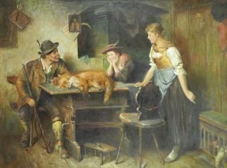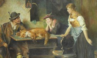 LOT 46 Oil on Canvas After Adolph Eberle, 36 x 48", "The Fox & The Hunter". Estimate: $200 - $400 Auction Date: Tuesday, March 04 2025 at 4:00 PM