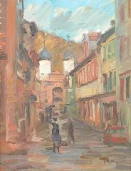 LOT 112 Oil on Canvas signed (Pierre) Gogois , 25 3/4 x 19 3/4", "Street Scene in Heidlberg. Estimate: $100 - $200 Sold For: $60 Auction Date: Tuesday, April 29 2025 at 4:00 PM