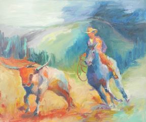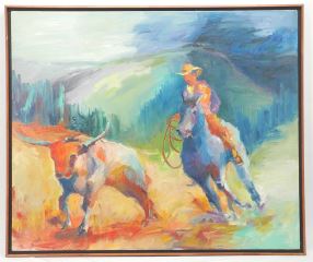 LOT 37 Oil on Canvas signed Christine Kozak, 37 x 30", "Steer Roper", 1987 Estimate: $80 - $120 Sold For: $150 Auction Date: Tuesday, April 29 2025 at 4:00 PM