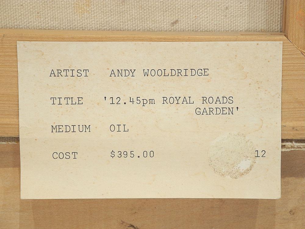 LOT 150 Oil on Canvas signed Andy Wooldridge Verso, 12 x 16", "12:45pm Royal Roads Garden". Estimate: $200 - $300 Sold For: $325 Auction Date: Tuesday, April 29 2025 at 4:00 PM
