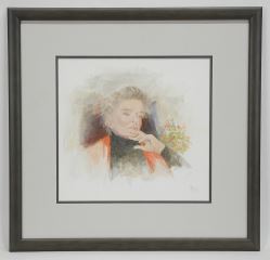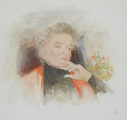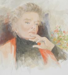 Watercolour signed Myfanwy (Pavelic) , 9 x 9 3/8", "Portrait of Katherine Hepburn".