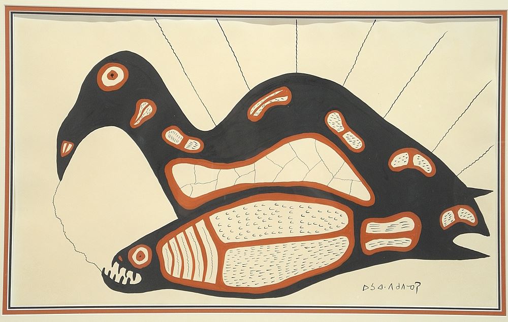 LOT 14 Ink & Tempera on Paper signed Norval Morrisseau, 13 3/8 x 22 1/2", "Loon & Fish". Estimate: $2,500 - $3,500 Auction Date: Tuesday, October 07 2025 at 4:00 PM