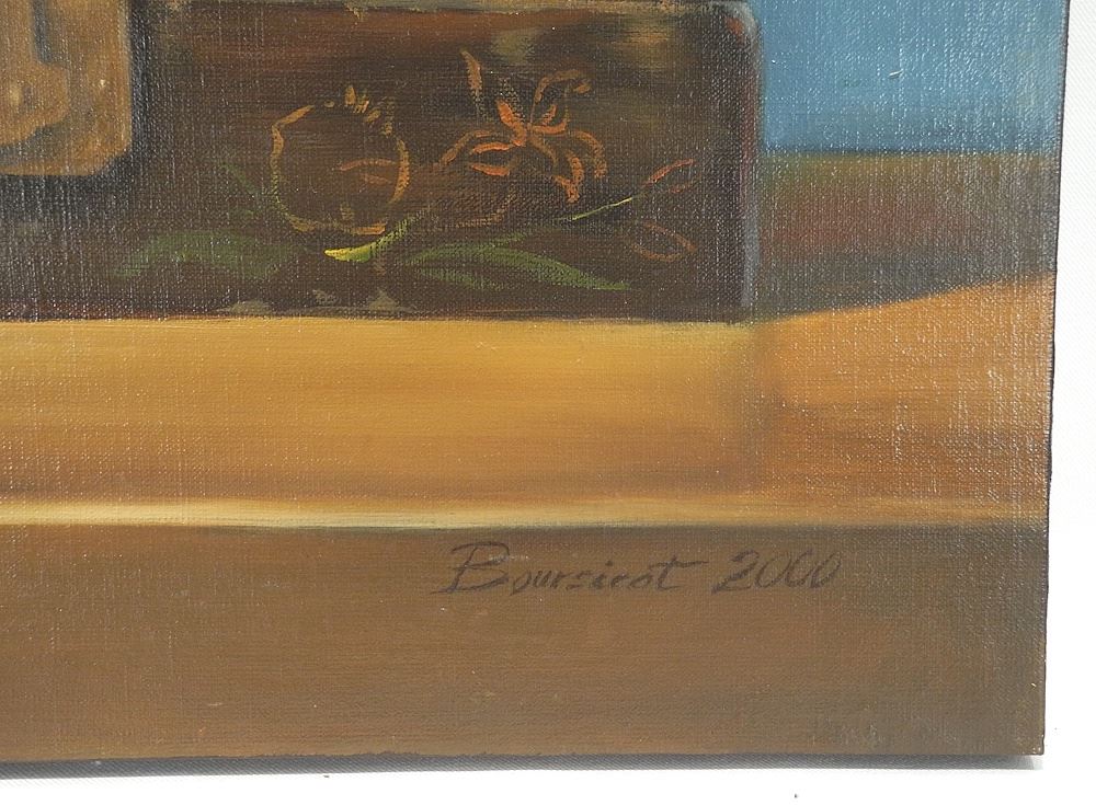 Oil on Board signed (Mandy) Boursicot 2000, 16 5/8 x 33", "Still Life w/Chinese Antiques" #