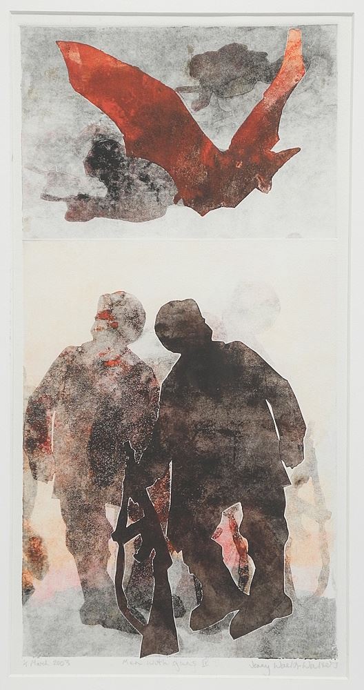 Papercut Monotype signed Jenny Waelti-Walters, 18 1/2 x 9 1/2", "Men With Guns IV".