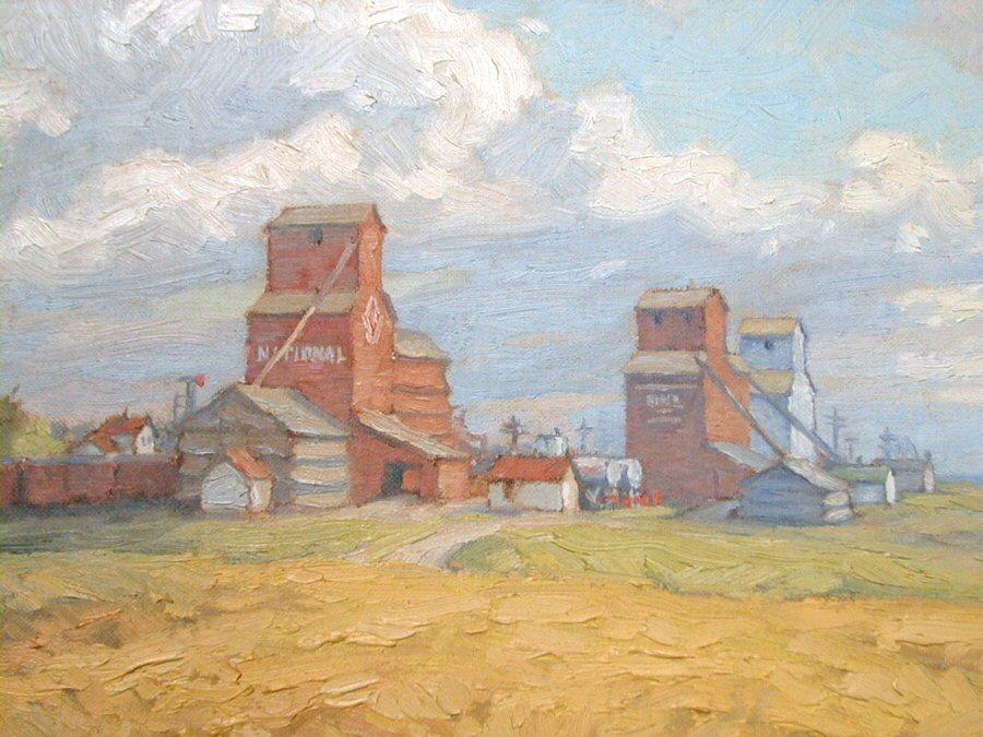 Oil painting on board signed E. Luthi, 16 x 20, "Grain Elevators"