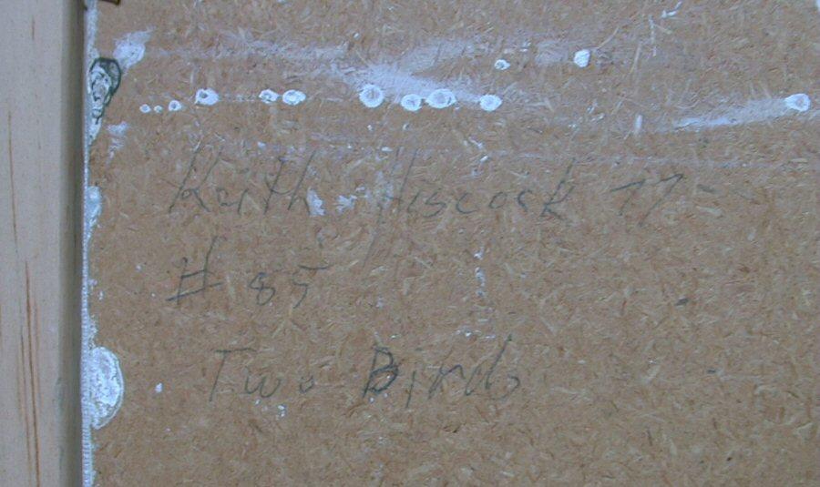 LOT 52 Acrylic painting on board signed Keith Hiscock, 7 1/2" x 9 1/2", "Two Birds". Estimate: $300 - $500 Sold For: $575 Auction Date: Monday, April 19 2004 at 7:00 PM