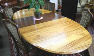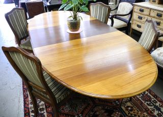 LOT 110 Regency Style Mahogany Pedestal Table & 4 Chairs, one leaf different tone. Estimate: $150 - $300 Auction Date: Tuesday, June 29 2021 at 6:00 PM
