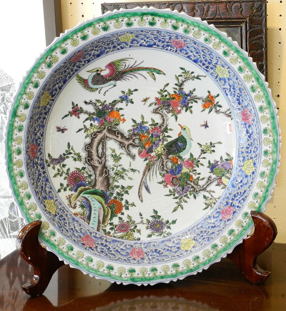 Chinese Famille Verte Low Bowl, Kangxi Mark, 17 1/4" diameter.