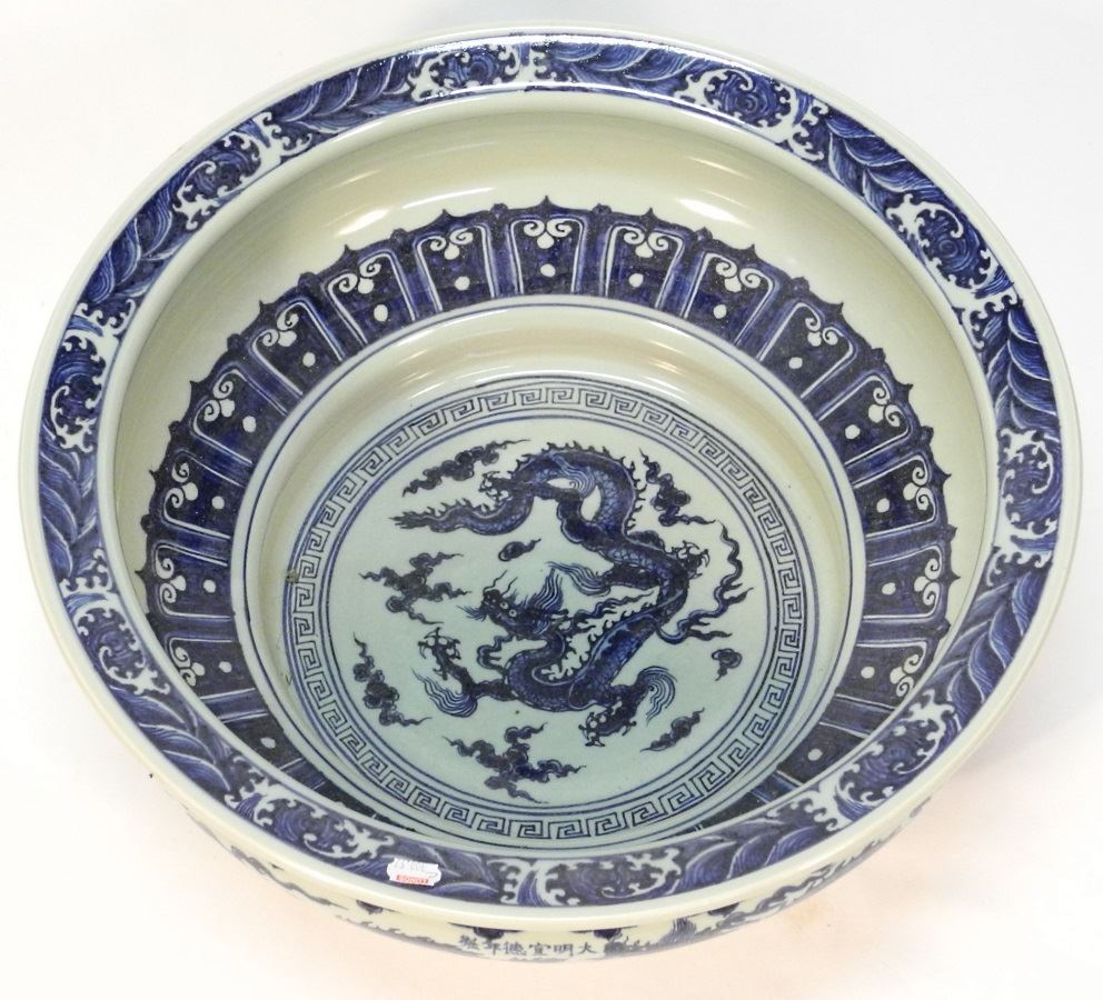 Chinese blue & white porcelain "Dragon" basin, 20th Century, 18 1/2" diameter.