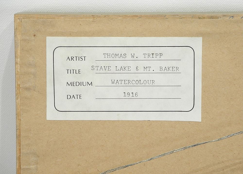Watercolour signed Tom Fripp 1916, 7 1/2 x 5 1/2", "Stave Lake & Mount Baker".