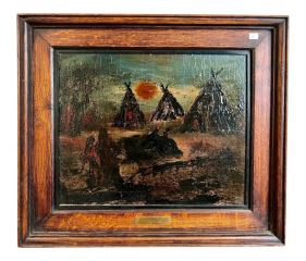 LOT 108 Oil on Panel signed H.H. Elliott Verso, 13 1/4 x 16 1/4", "Inhabitants Indian Enca.. Estimate: $200 - $400 Sold For: $300 Auction Date: Tuesday, February 24 2026 at 4:00 PM