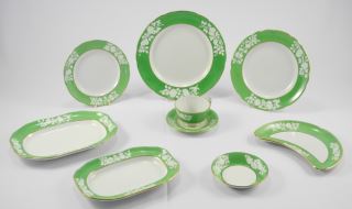 "Spode" China Part Dinner Service, apple green borders with raised flowers.