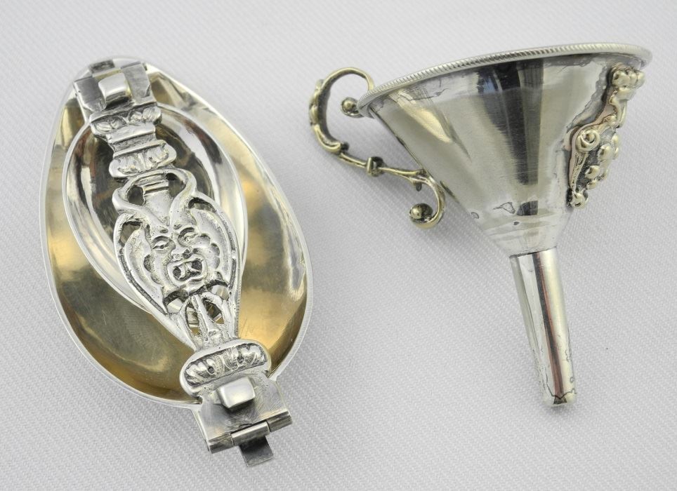 LOT 92 Two Bowl Continental Folding Traveling Spoon and a Plated Funnel. Estimate: $100 - $150 Sold For: $200 Auction Date: Saturday, October 22 2016 lots 1-400 at 1:00 PM, lots 401-733 at 6:00 PM