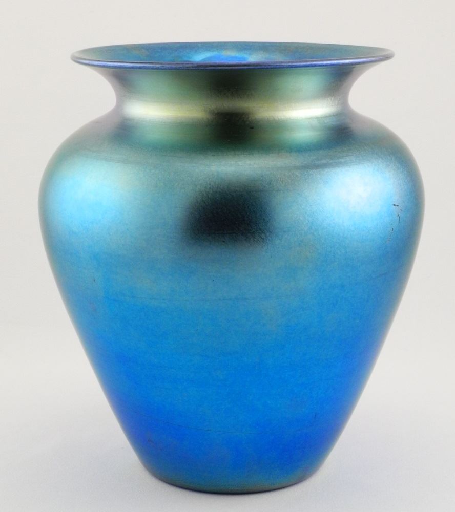 LOT 412 Large Blue Iridescent Glass Vase, possibly Steuben, 8 1/2" high. Estimate: $300 - $500 Sold For: $550 Auction Date: Saturday, October 22 2016 lots 1-400 at 1:00 PM, lots 401-733 at 6:00 PM