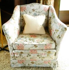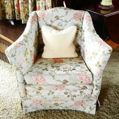 Pair of Upholstered Shaped Back Tub Chairs with flared arms.