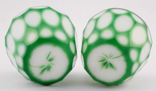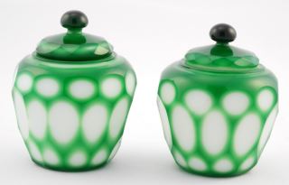 LOT 354 Pair of Green and White glass Covered Jars, 3". Estimate: $100 - $150 Sold For: $175 Auction Date: Saturday, October 22 2016 lots 1-400 at 1:00 PM, lots 401-733 at 6:00 PM