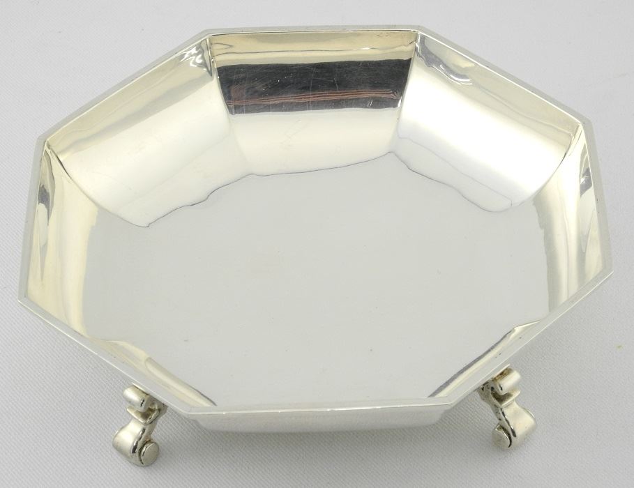 LOT 661 Hallmarked Silver Octagonal Shaped Bowl on four feet, London 1934, maker RC - 7 3/4". Estimate: $175 - $225 Sold For: $200 Auction Date: Saturday, October 22 2016 lots 1-400 at 1:00 PM, lots 401-733 at 6:00 PM