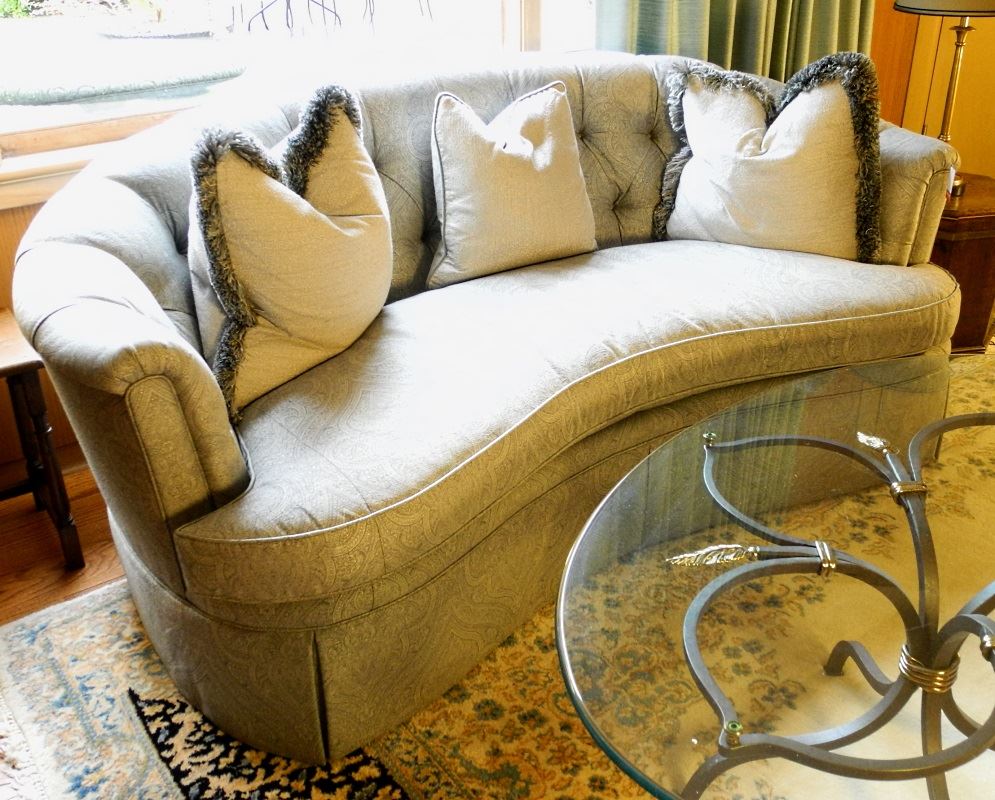 Theodore Alexander blue upholstered curved fluted settee.