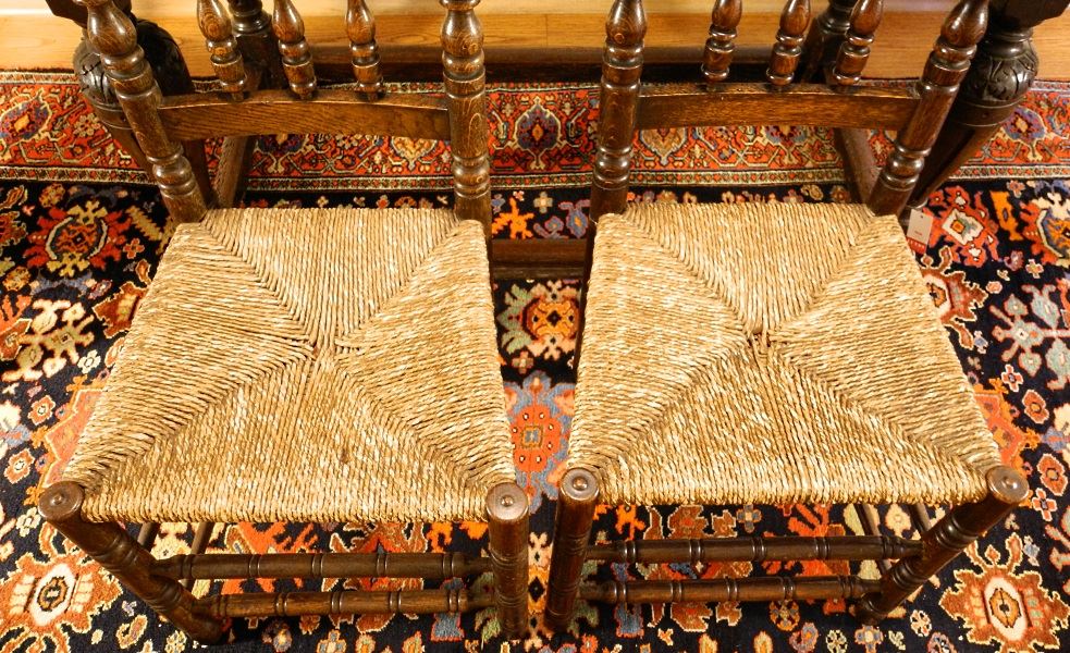 Set of oak rush seated spool back side chairs.