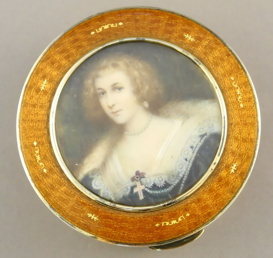LOT 138 Gilded 900 silver Austro Hungarian guilloche dresser box with miniature - 3 1/8". Estimate: $500 - $750 Sold For: $600 Auction Date: Tuesday, July 21 2020 at 7:00 PM