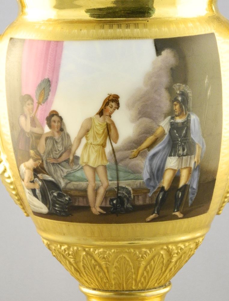 Russian Porcelain Urn, Neoclassical Scene, left foot chipped on bottom, 11 3/4 high.