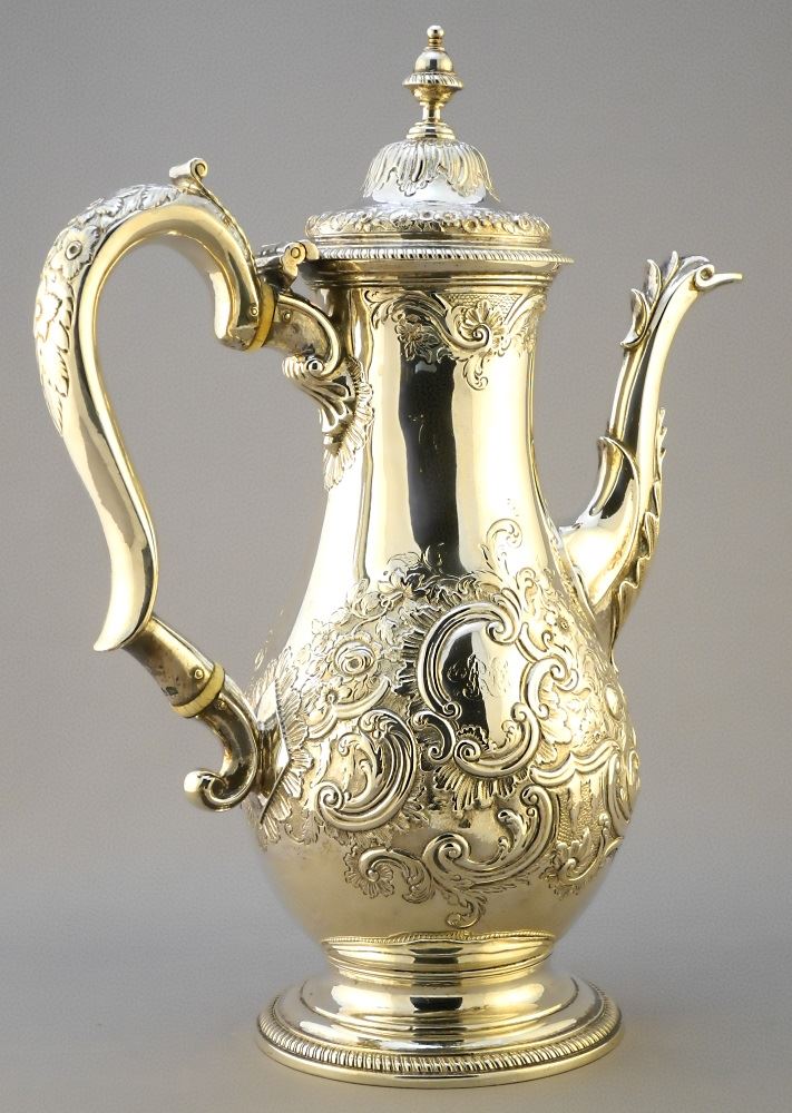Georgian Silver Coffee Pot: JP/ London / 1775, 11 1/4" high.