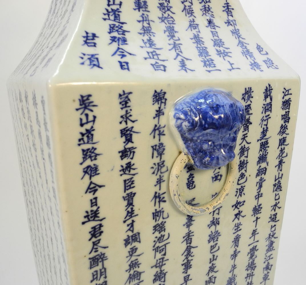 LOT 31 Chinese Quadrangular Porcelain Calligraphy Vase, damage & resto. to handles noted, 23 1/4" Estimate: $300 - $500 Auction Date: Tuesday, July 27 2021 at 6:00 PM