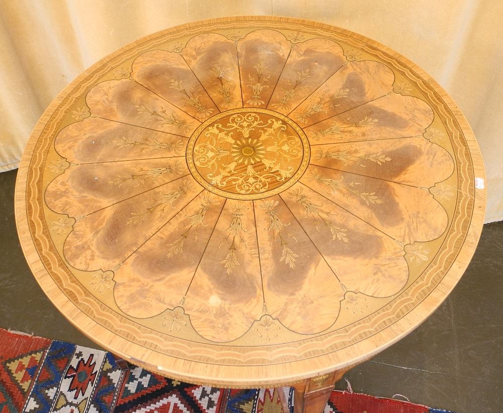 LOT 104 Edwardian Patera Inlaid Center Table, 29 1/2" x 30" diameter. Estimate: $300 - $400 Sold For: $240 Auction Date: Tuesday, July 27 2021 at 6:00 PM
