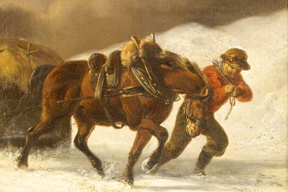 LOT 113 Oil on Board Signed K.F. Bombled, 8" x 11", "Farmer Guiding Horse Through Snow". Estimate: $400 - $500 Sold For: $500 Auction Date: Tuesday, July 27 2021 at 6:00 PM