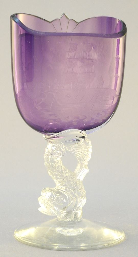 LOT 163 Pair of Regency Purple Glass Vases with Etched Ships & Dolphins, taller 5 3/4" high. Estimate: $100 - $200 Sold For: $240 Auction Date: Tuesday, July 27 2021 at 6:00 PM
