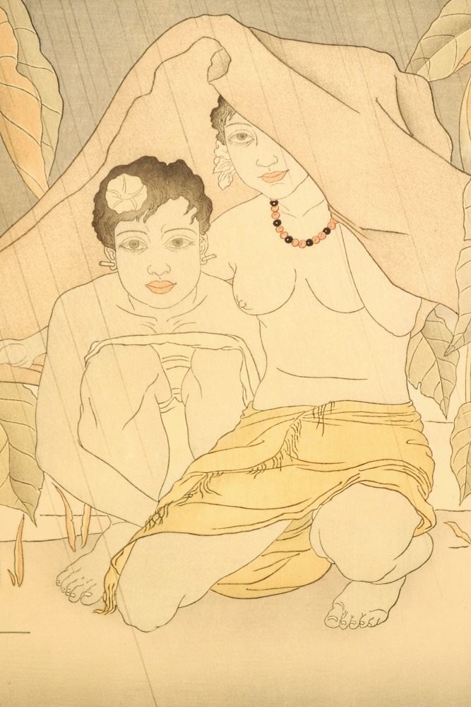 Woodblock Print signed P. Jacoulet in plate, 17 1/4" x 13 1/2", "Downpour at Metalanim..".