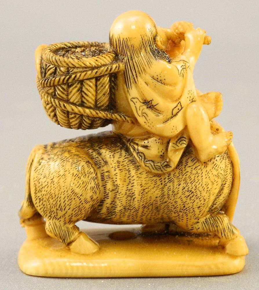 Japanese Netsuke of a Figure on an Ox, 1 3/4" high, no export.
