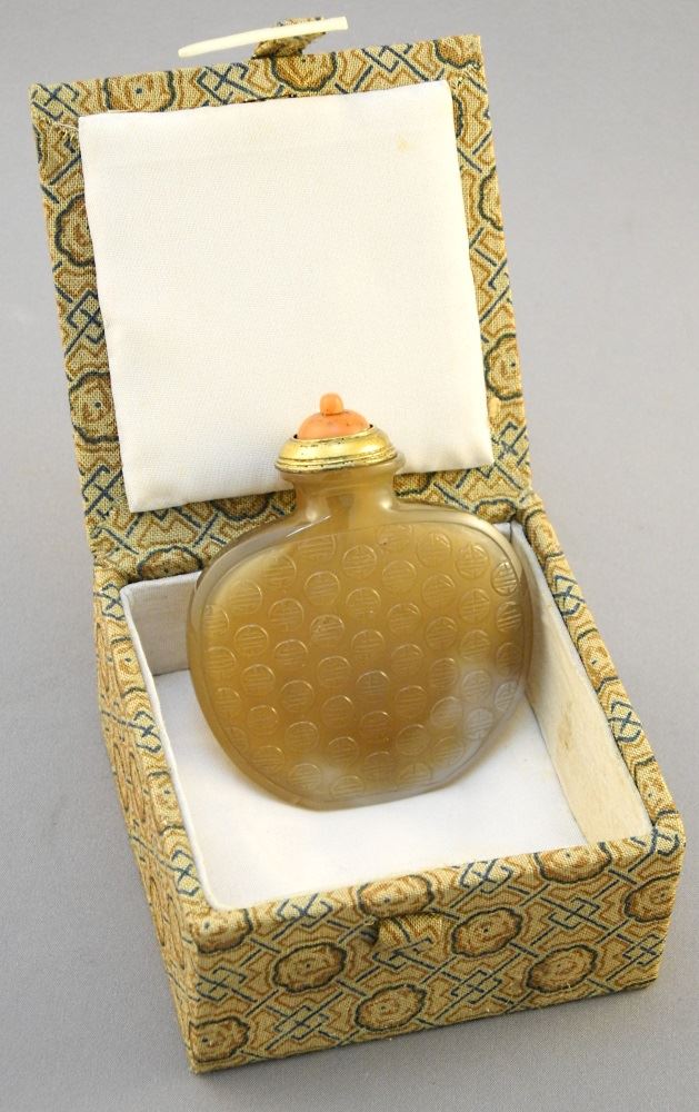 Chinese Agate "Shou" Snuff Bottle, 2 7/8" high, no export.